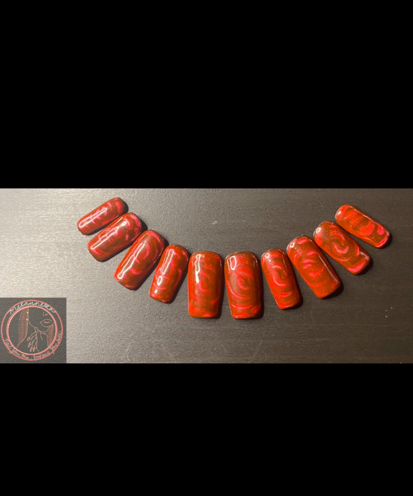 Boost your confidence and bring the heat with “Fire and Desire”! These vibrant red hot press on nails feature stunning cat eye roses, making them the perfect bold and daring addition to your outfit! Whether it’s a big night out or a date night, don't be afraid to take risks and stand out with “Fire and Desire”!