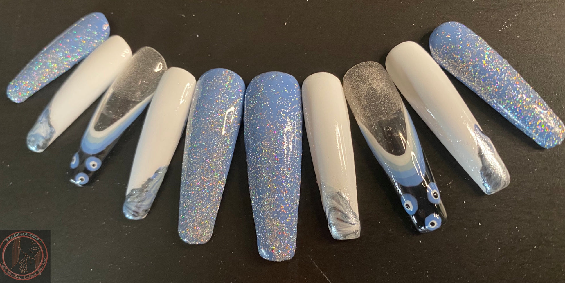 Get ready to channel your inner queen with Blue Majesty! This majestic nail polish features mysterious evil eye design and gorgeous blue hues, sprinkled with sparkling glitter and marble effects. The perfect touch for a striking French manicure. Bow down to your stunning new nails.
