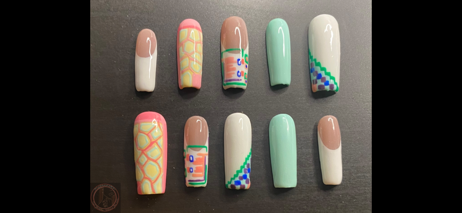 10 hand painted and designed nails. Please contact us via Instagram for sizing. Please note, I cannot accept returns due to incorrect sizing for hygiene reasons.