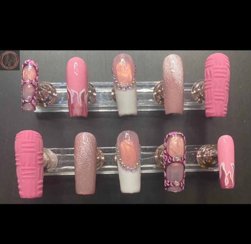 Get ready to paint the town pink with Pink Mania! This nail polish kit features a variety of stunning shades in textured, chrome, and flame designs, as well as classic french manicure and gemstone options. Elevate your nail game with ease and show off your playful personality.