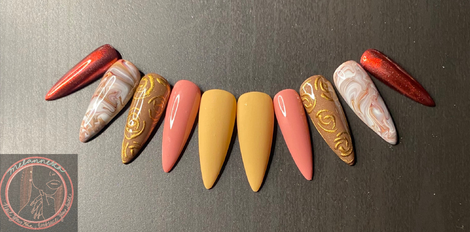 Indulge in the rich harmony of Sunset Symphony—a luxurious press-on nail set inspired by golden hour magic. This curated blend of terracotta tones, golden swirls, and marble accents captures the warmth of a summer sunset and the elegance of a symphony in motion. Crafted for the modern woman who craves elevated beauty without the salon wait. Perfect for brunch dates, golden hour selfies, and everything in between—just press, slay, and go.