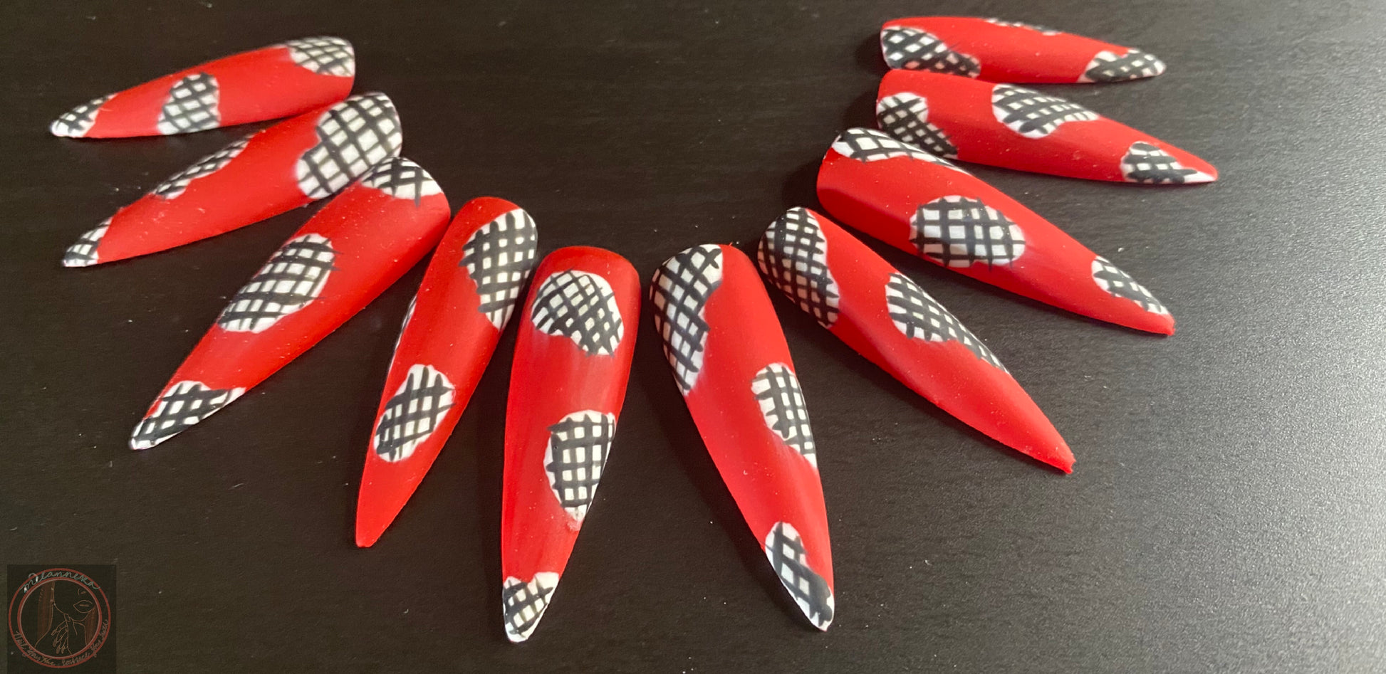 10 hand painted and designed nails. Please contact us via Instagram for sizing. Please note, I cannot accept returns due to incorrect sizing for hygiene reasons.