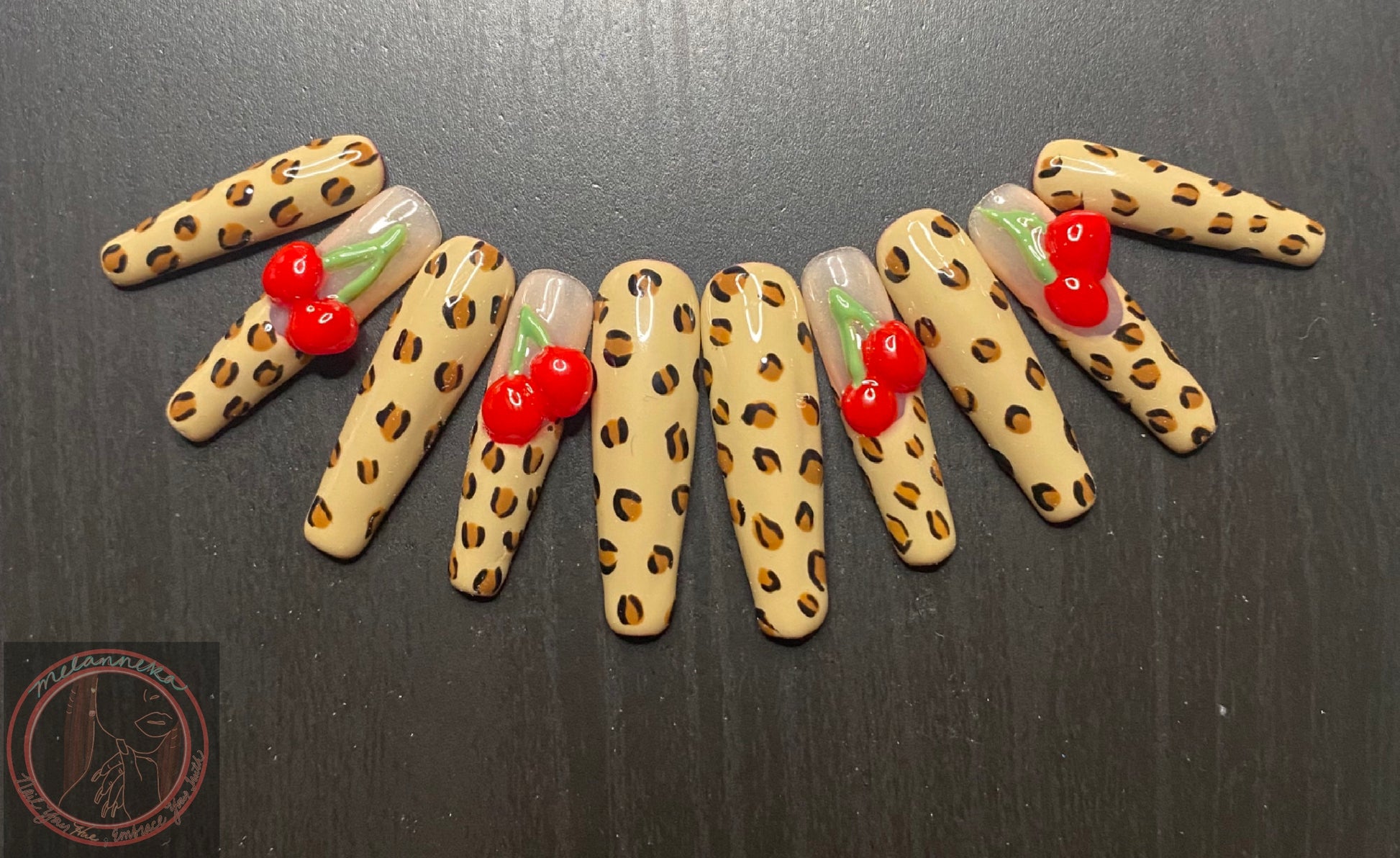 Unleash your Wild Side with these fierce press on nails! Featuring an eye-catching animal print and sweet cherry accents, these nails have a surprise ‘red bottom’ feature that will add an extra touch of sass to your look. Step out with confidence and turn heads with these bold and beautiful nails.